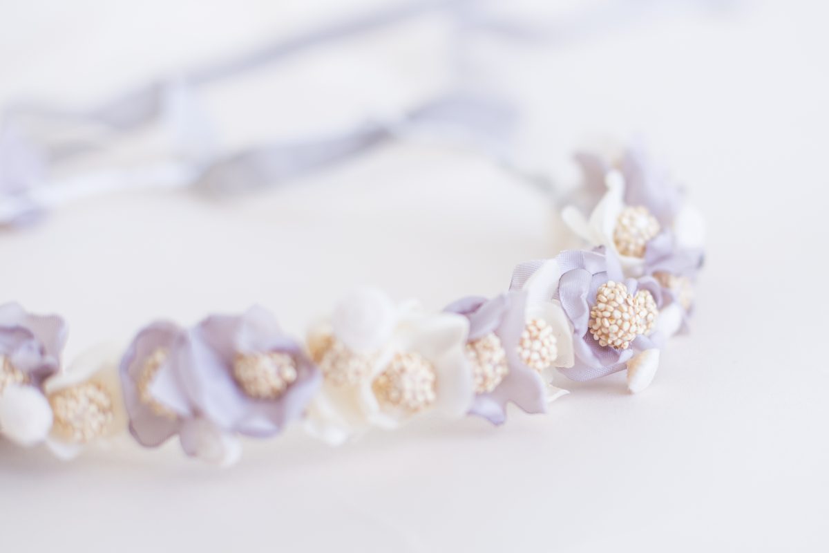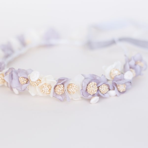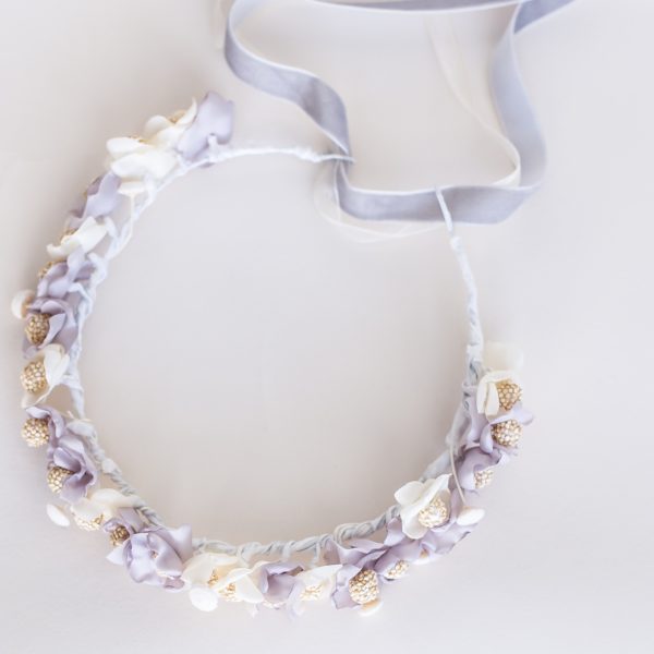 Corona realizada a mano con flores artesanales de tela, hechas una a una, mezcladas con botao preservado color marfil.
