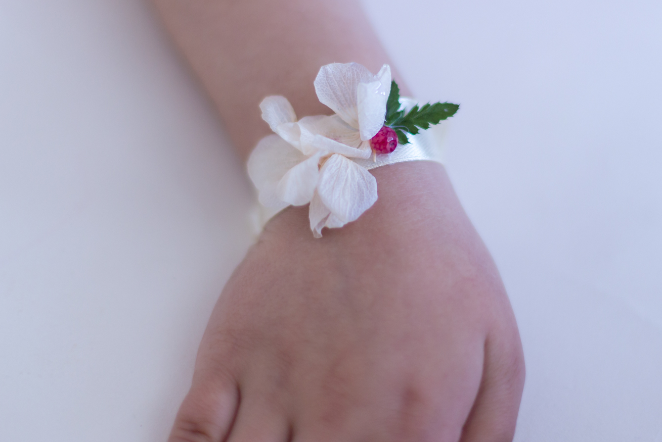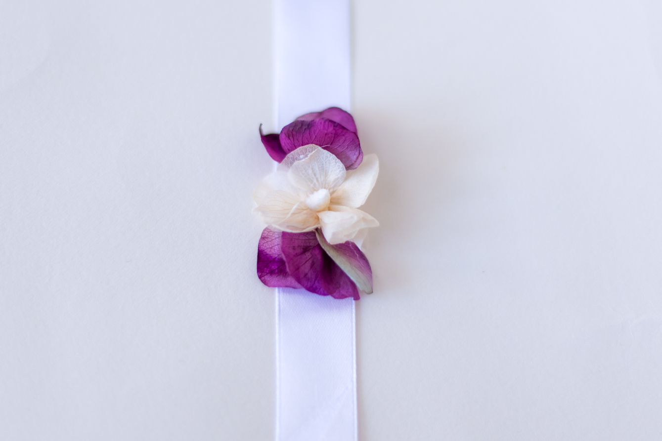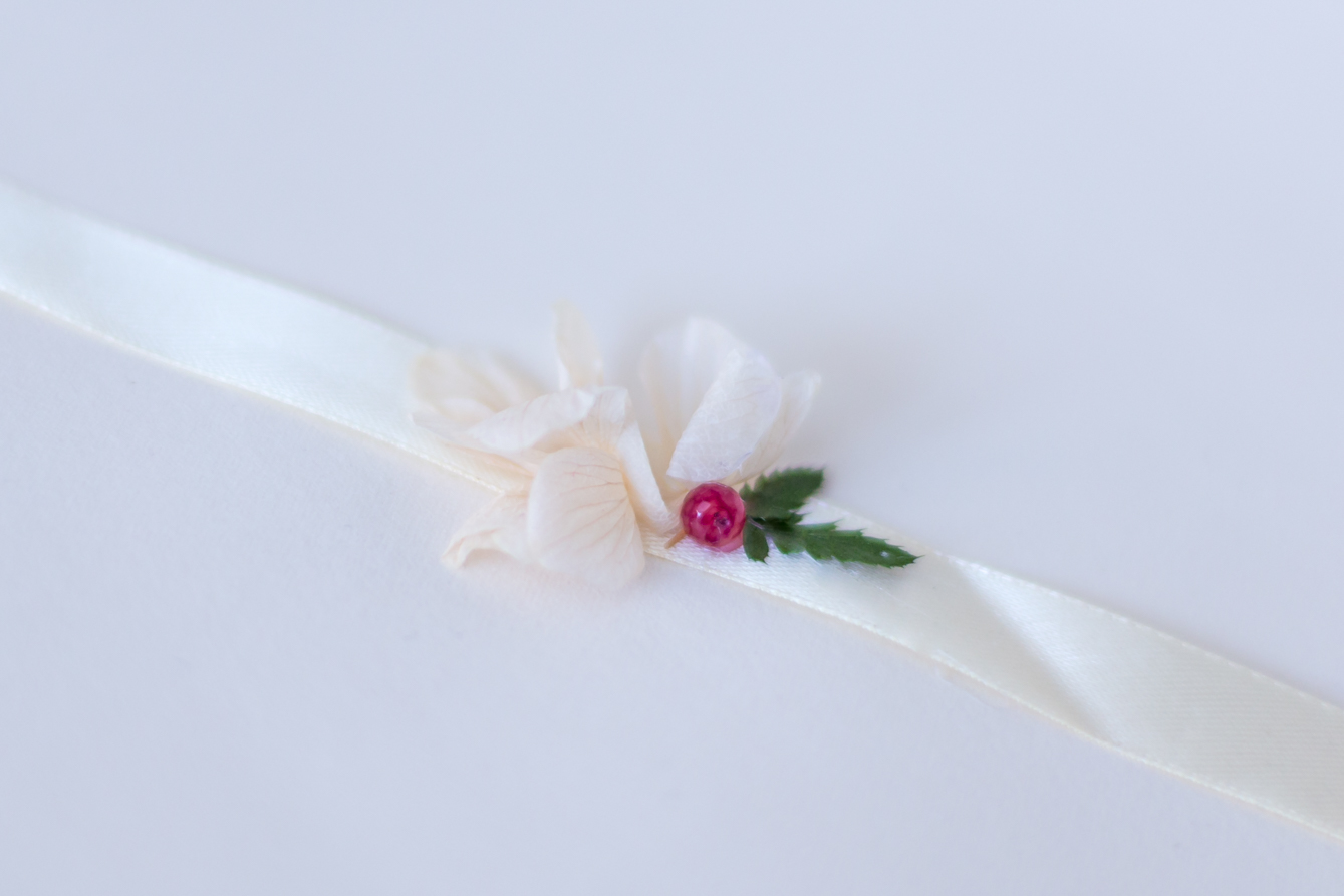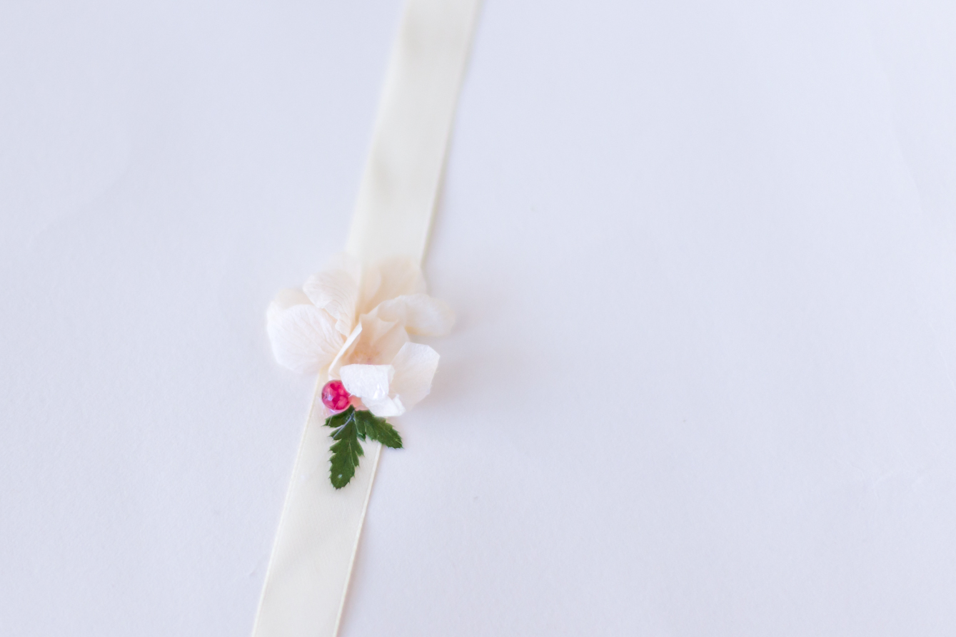 Pulsera montada en cinta estrecha raso con flor de hortensia preservada marfil, hoja helecho preservado baby y cuenta de amatista color cereza.