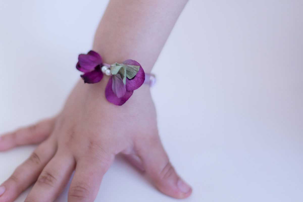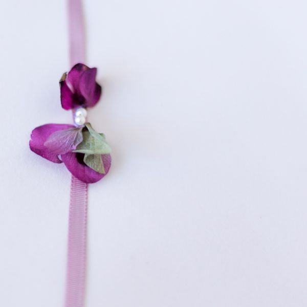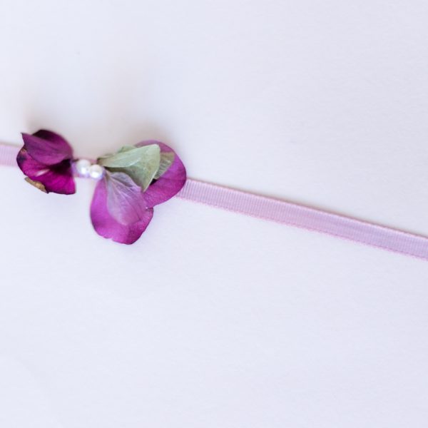 Pulsera montada en cinta estrecha grosgrein con flor de hortensia preservada y dos mini perlas.