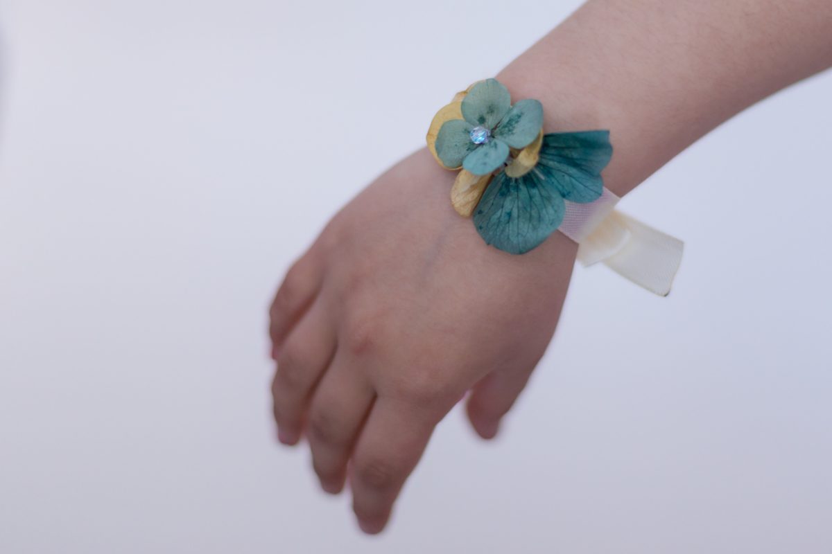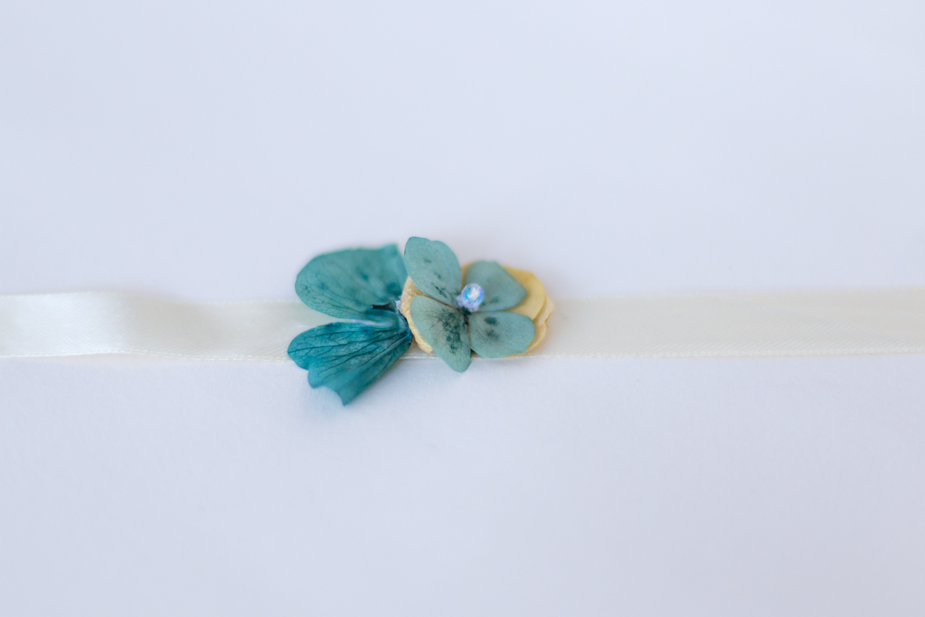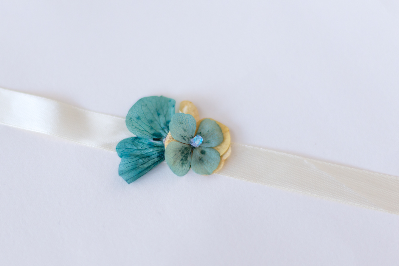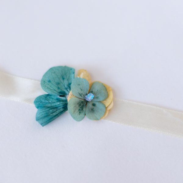 Pulsera montada en cinta raso marfil con flor de hortensia preservada turquesa, verde agua y marfil con cuenta swarosky facetado central.