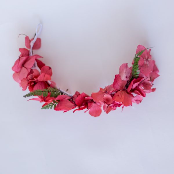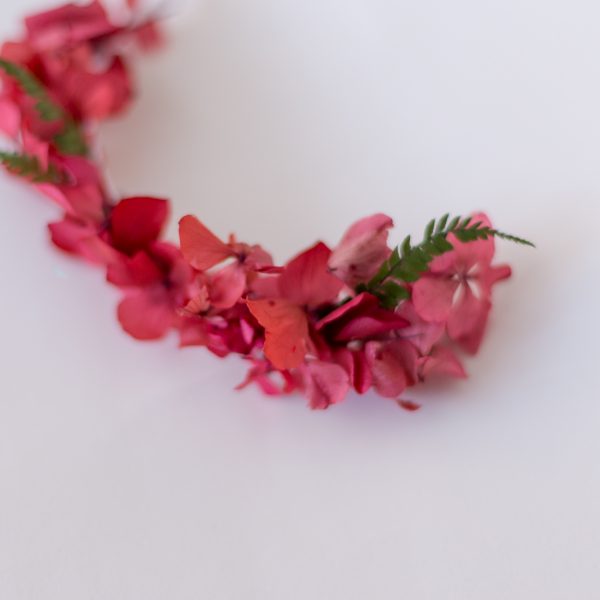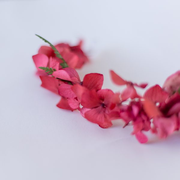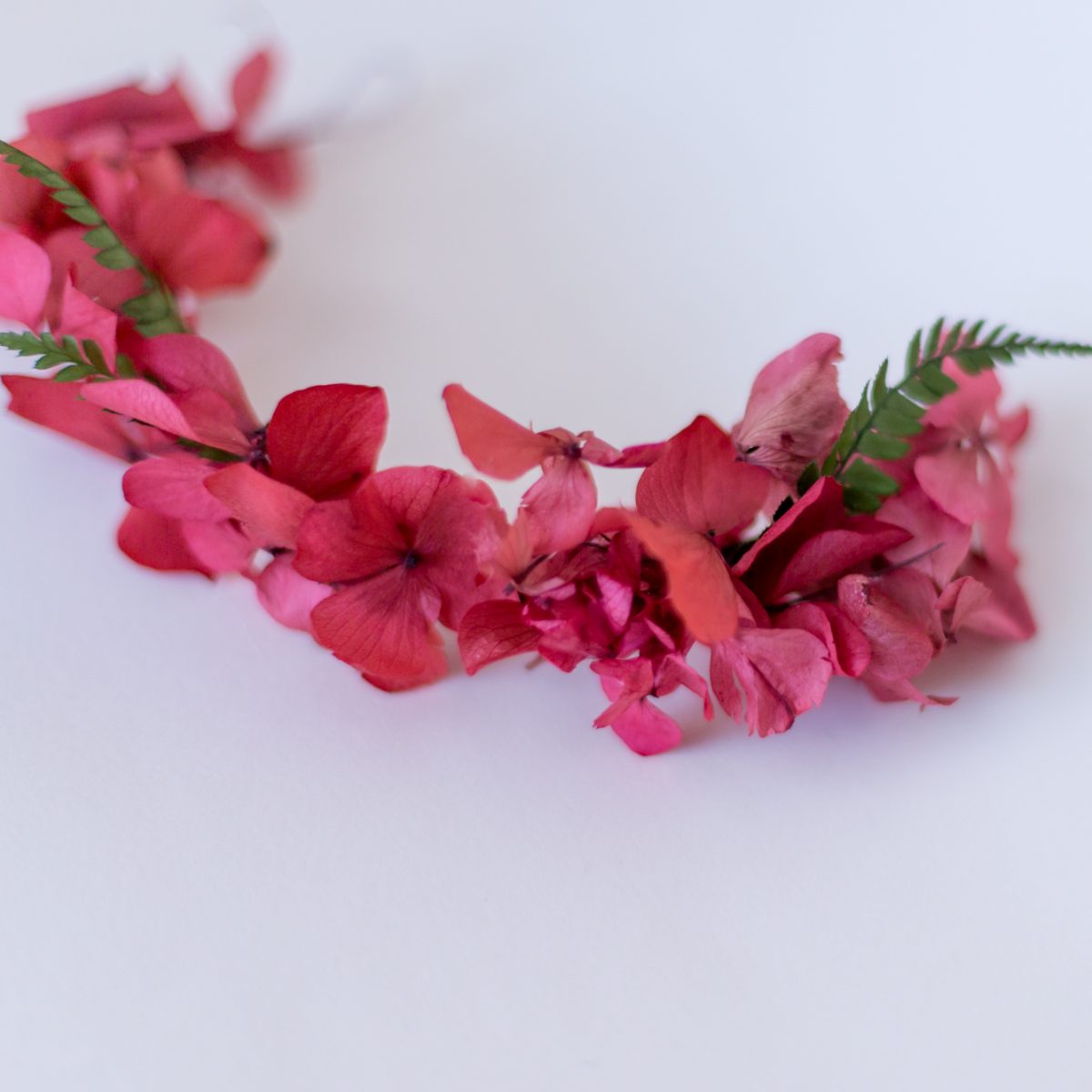 El Semirecogido fresa está realizado con hortensias preservadas y pequeñas hojas de helecho.